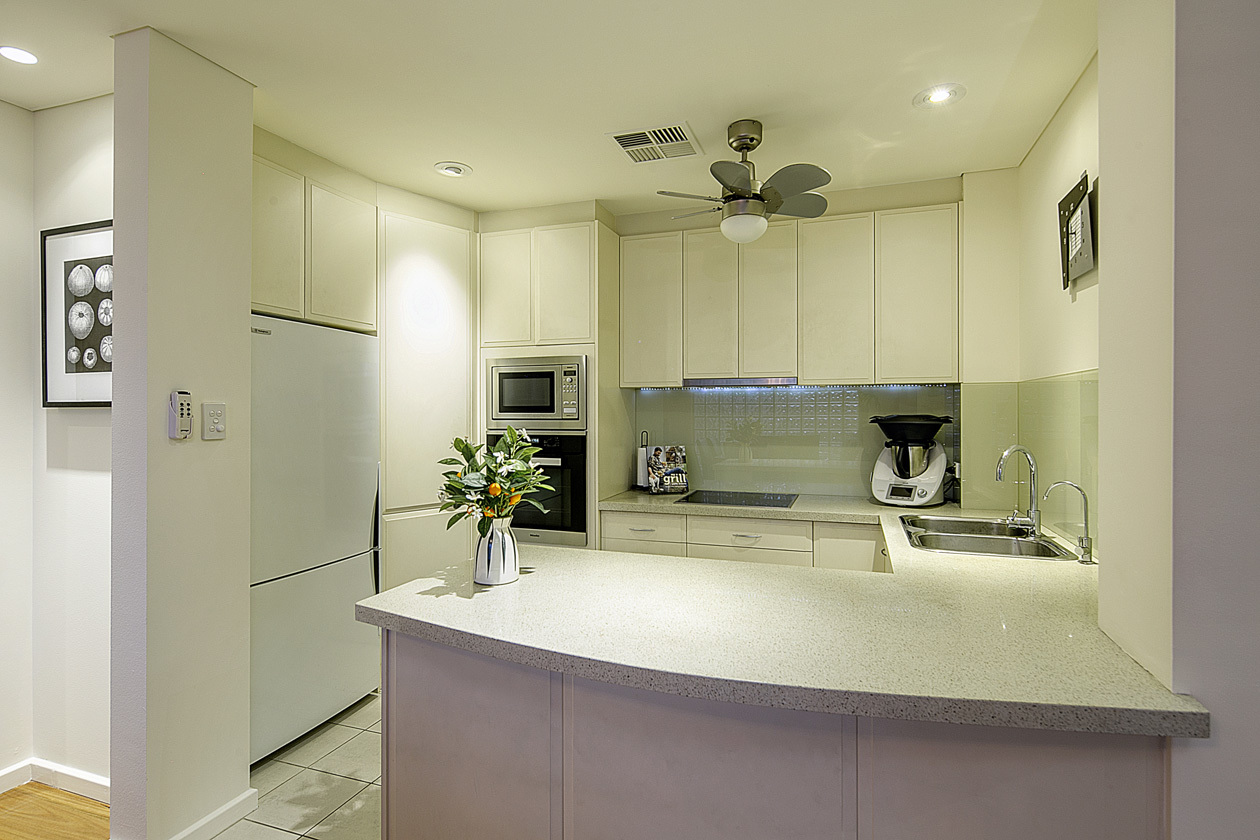 - Kitchen with Caesarstone benchtops, glass splashbacks and stainless steel Miele electric appliances, walk-in pantry